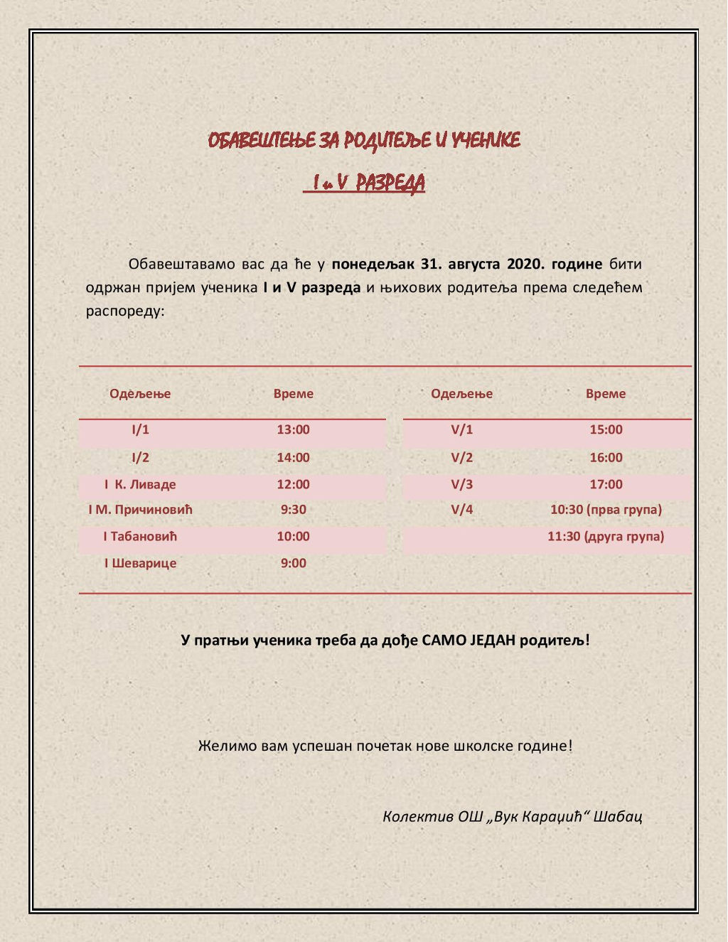 Обавештење за родитеље и ученике 1. и 5. разреда