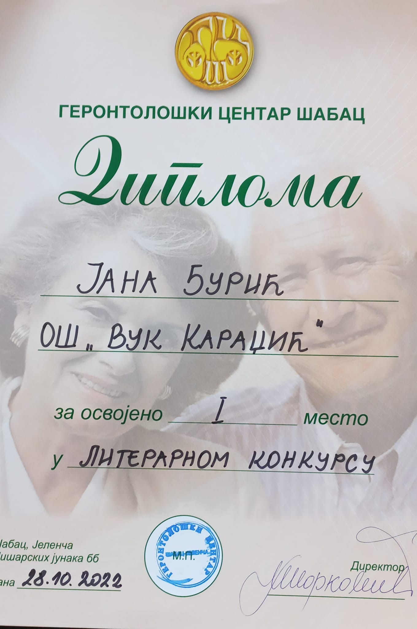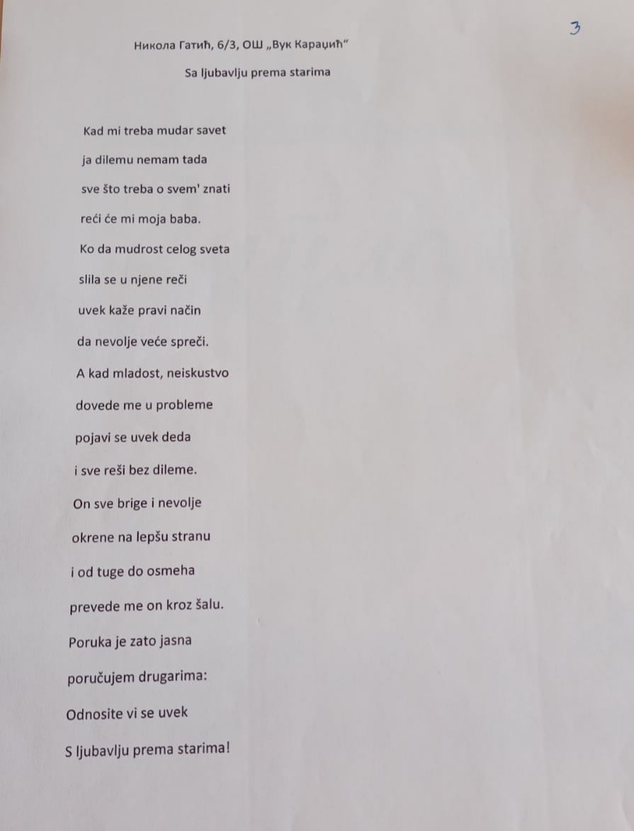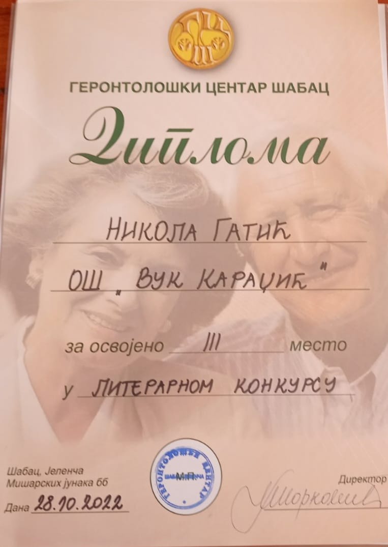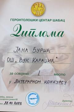 У оквиру обележавања месеца солидарности са старима у Геронтолошком центру Шабац, током октобра су организоване разне активности, а ученици наше школе су учествовали у једној од њих - литерарном конкурсу на теме „Старима с љубављу“ и „Ослонимо се једни на друге“. Јана Ђурић 8/2 освојила је прво, Ана Живановић 7/3 друго, а Никола Гатић 6/3 треће место! 28. октобра у Геронтолошком центру одржана је свечана додела диплома и вредних награда за ученике, а директору школе Драгославу Павловићу уручена је захвалница у име успешне сарадње наших установа.