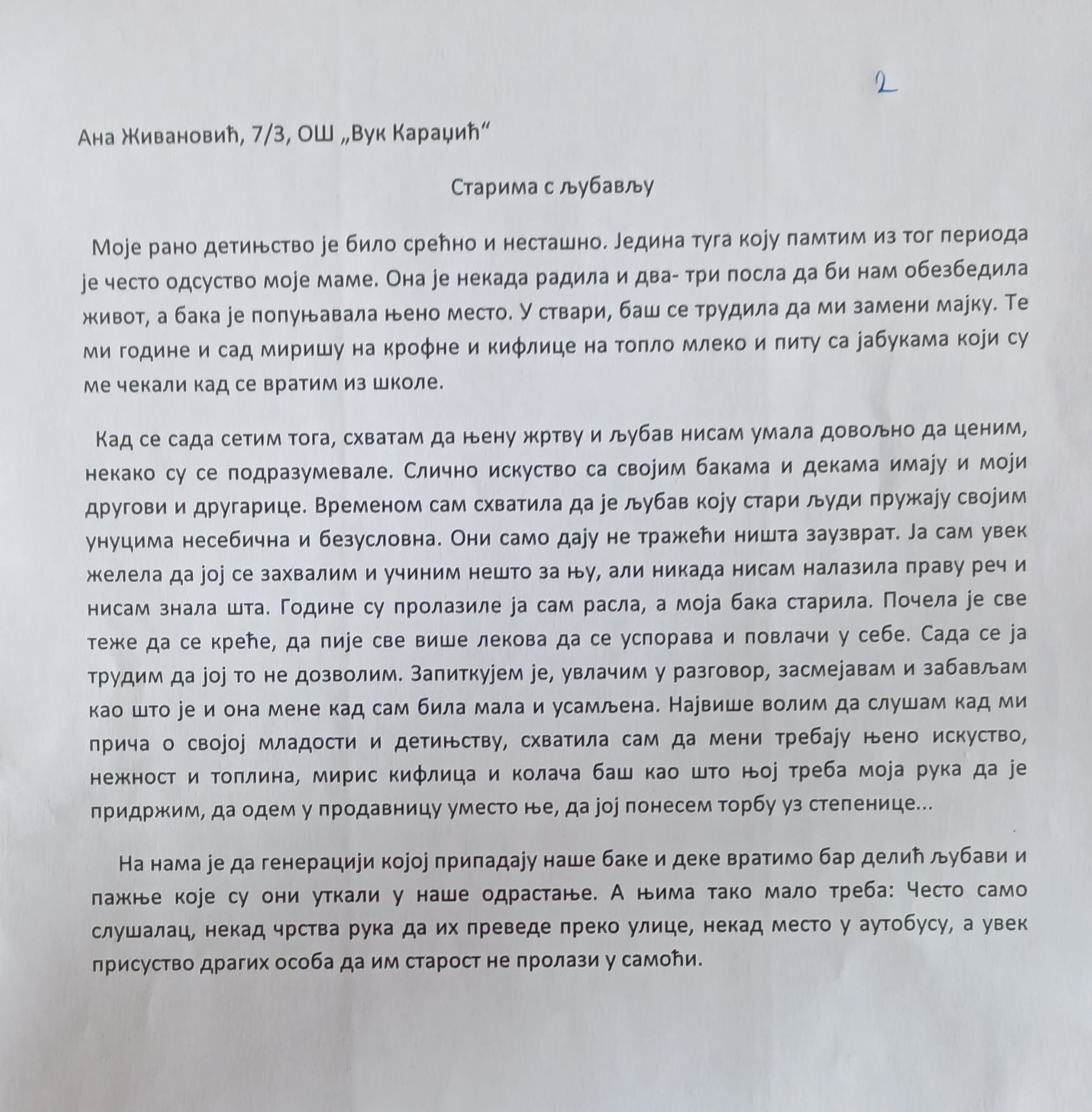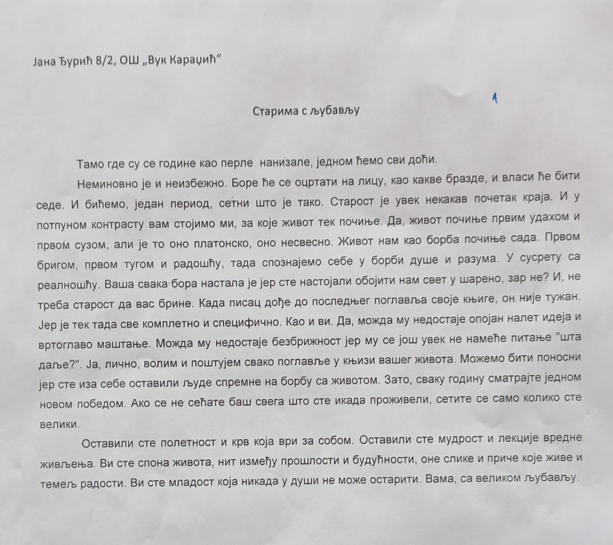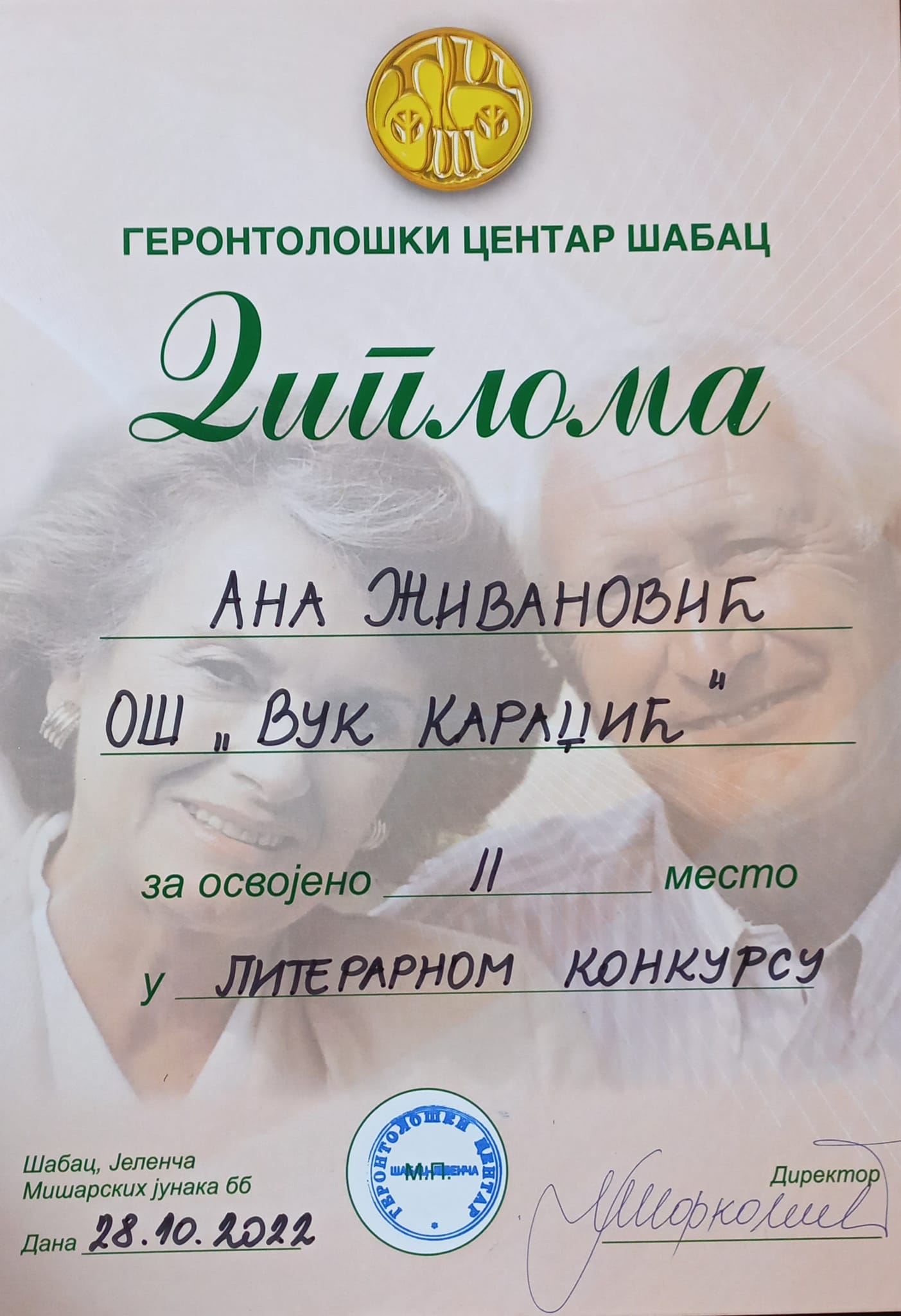 У оквиру обележавања месеца солидарности са старима у Геронтолошком центру Шабац, током октобра су организоване разне активности, а ученици наше школе су учествовали у једној од њих - литерарном конкурсу на теме „Старима с љубављу“ и „Ослонимо се једни на друге“. Јана Ђурић 8/2 освојила је прво, Ана Живановић 7/3 друго, а Никола Гатић 6/3 треће место! 28. октобра у Геронтолошком центру одржана је свечана додела диплома и вредних награда за ученике, а директору школе Драгославу Павловићу уручена је захвалница у име успешне сарадње наших установа.