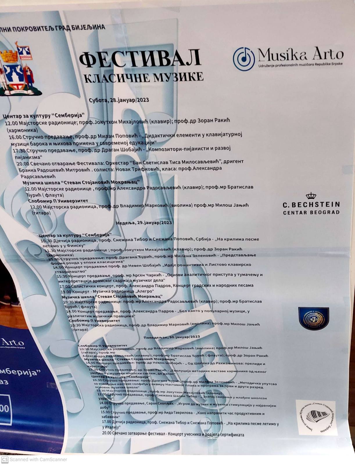 У оквиру Фестивала класичне музике у организацији Musika Arto-Бијељина, одржаног од 28. до 30.1.2023. године у Центру за културу Семберија у Бијељини одржана су предавања и радионице за наставнике, студенте и ученике. 29.1.2023. године одржане су радионице за ученике од 10.30 до 11.30 - “На крилима песме летимо у Финску”, а од 11.30 до 12.30 - “На крилима песме летимо у Италију” за ученике. Ученици су упознали главне одлике земље у коју су путовали, песме на језику који се говори у земљи, игру која се игра и правили су сувенир који асоцира на учену земљу. Реализатори радионица су биле: Снежана Шалаи Тибор, дипломирани професор опште музичке педагогије и Снежана Поповић педагошки саветник, обе из школе ОШ “Вук Караџић” Шабац. Следеће предавање је било истог дана од 15.30 до 16.30 за професоре разредне наставе са темом “Значај свирања у млађем школском узрасту”, на коме су колеге могле да чују о значају свирања у раном узрасту детета, као и да искуствено прођу кроз Орфову методу. Аутор и реализатор предавања: Снежана Шалаи Тибор, дипломирани професор опште музичке педагогије у МШ “Михаило Вукдраговић” Шабац и ОШ “Вук Караџић” Шабац. Пуни лепих утисака вратили смо се у Шабац. Извештај приредио: Снежана Шалаи Тибор, дипломирани професор опште музичке педагогије