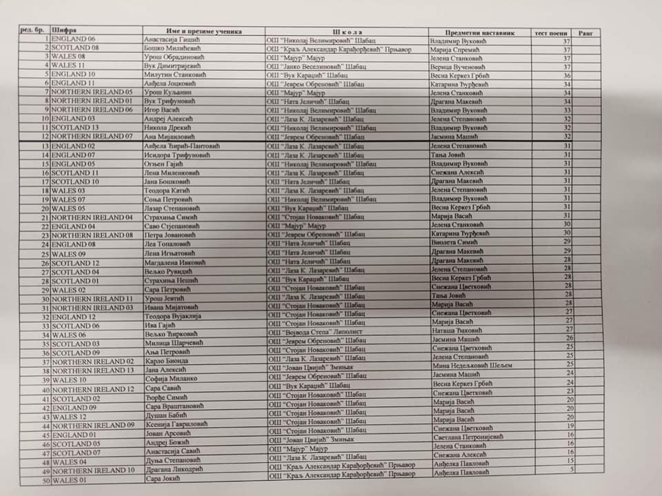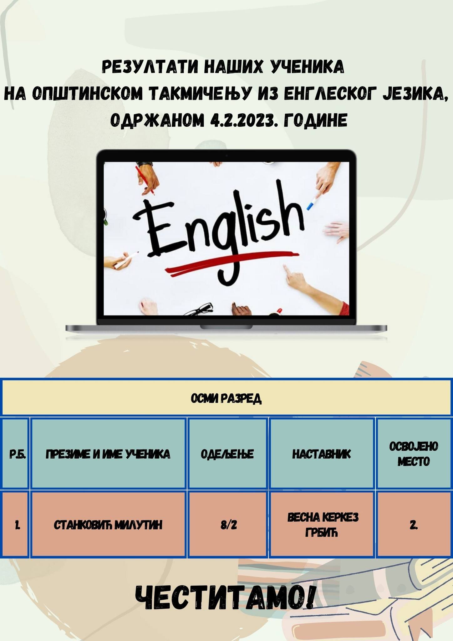 Честитамо Милутину, његовој наставници енглеског језика Весни Керкез Грбић, као и осталим ученицима наше школе који су учествовали - Лазару Степановићу 8/2, Страхињи Нешићу 8/1 и Сари Савић 8/1.