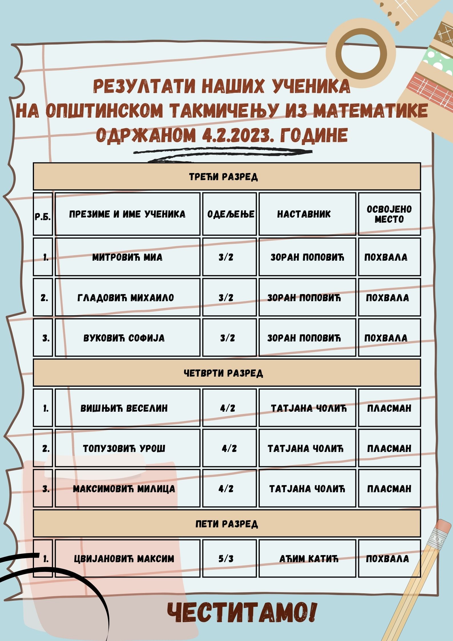 Резултати општинског такмичења из математике одржаног 4.2.2023. у ОШ "Лаза К. Лазаревић" Шабац