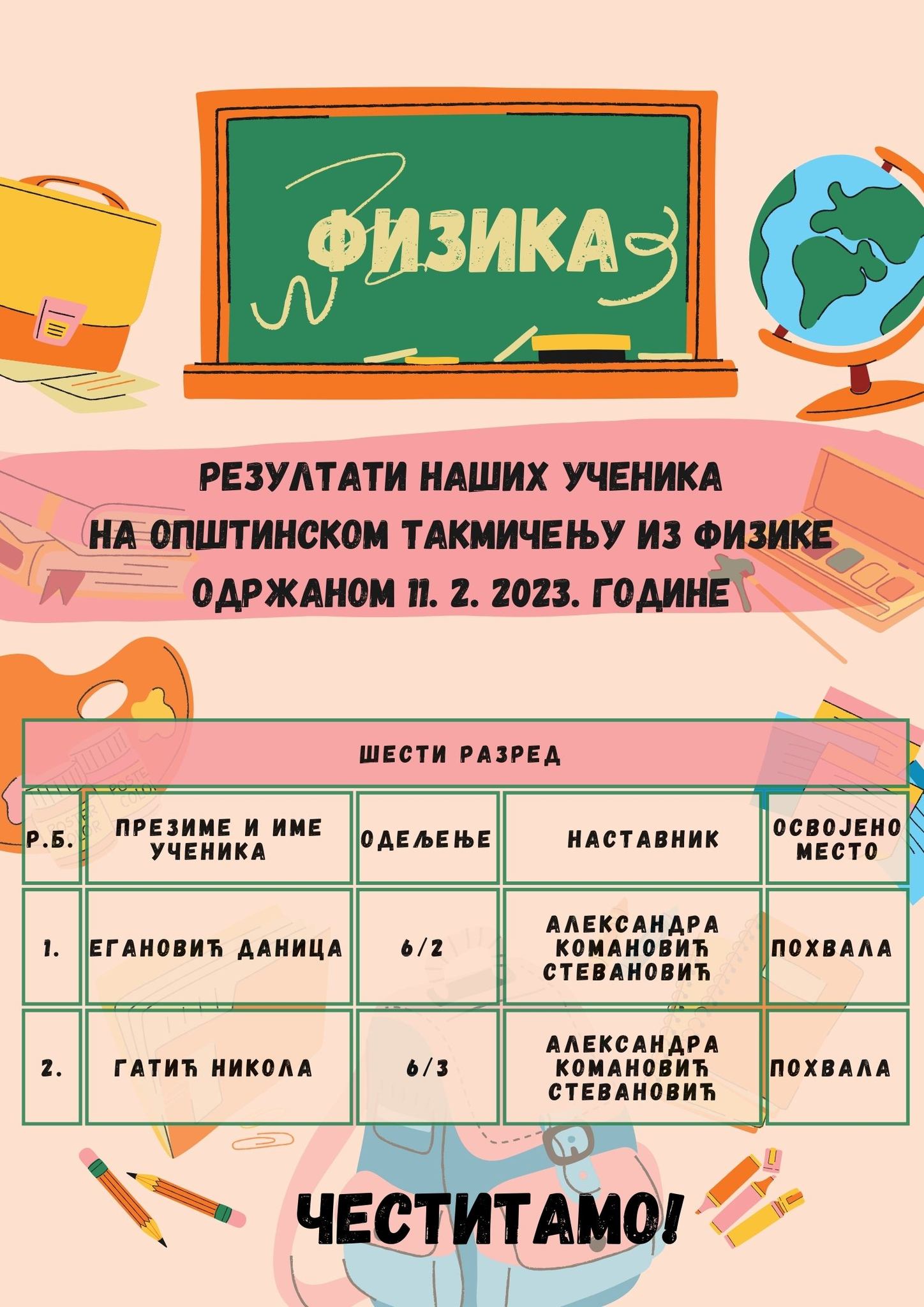 Резултати општинског такмичења из физике, одржаног 11.02.2023. у ОШ "Стојан Новаковић" Шабац