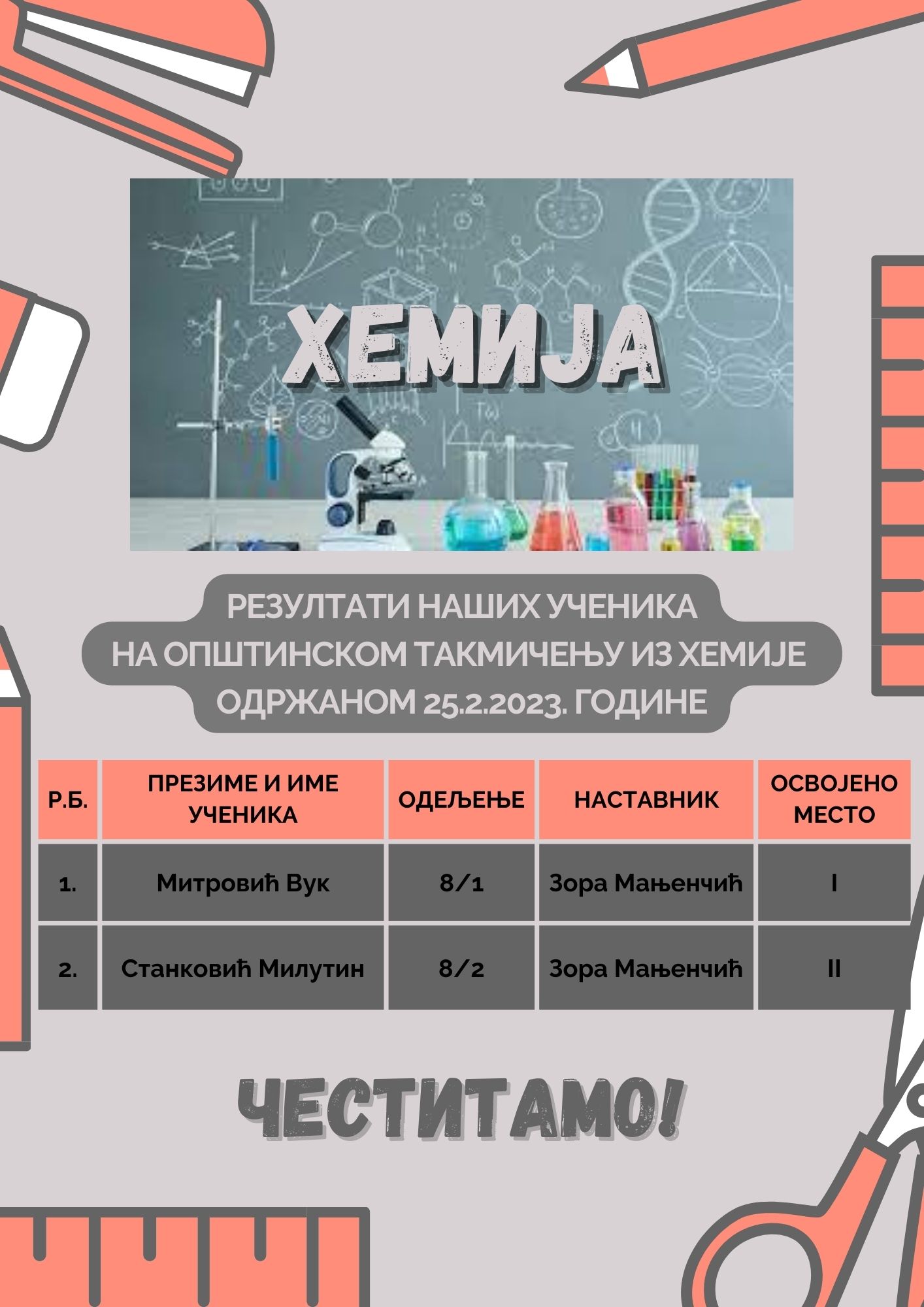 Резултати наших ученика на општинском такмичењу из хемије, одржаном 25.2.2023. године у ОШ "Ната Јеличић"