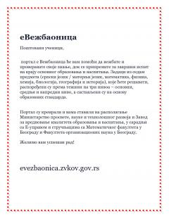 портал еВежбаоница ће вам помоћи да вежбате и проверавате своје знање, док се припремате за завршни испит на крају основног образовања и васпитања. Задаци из седам предмета (српски језик / матерњи језик, математика, физика, хемија, биологија, географија и историја), које ће те решавати, распоређени су према тежини на три нивоа – основни, средњи и напредни ниво, а састављени су на основу образовних стандарда.