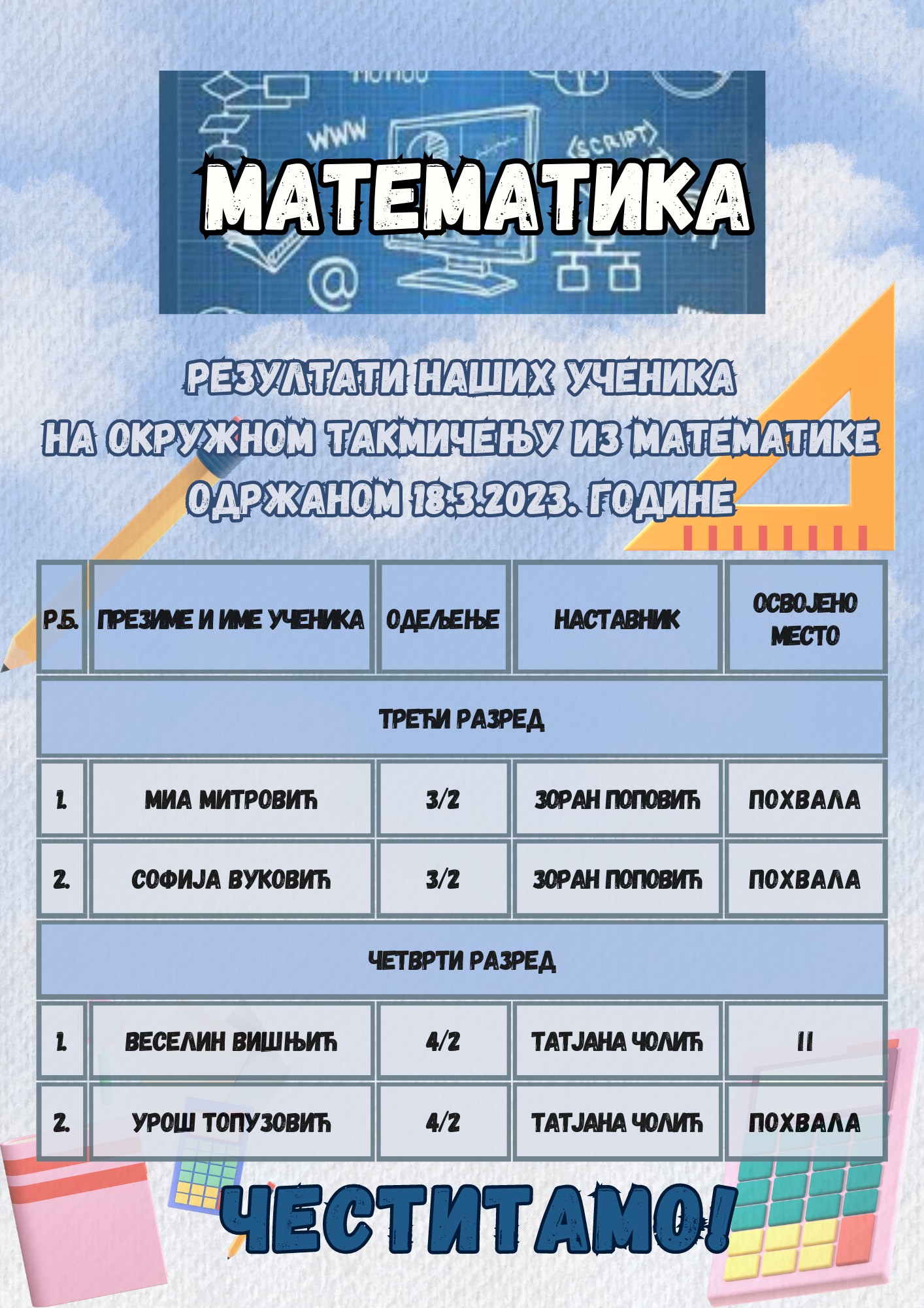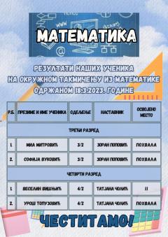 Резултати наших ученика на окружном такмичењу из математике