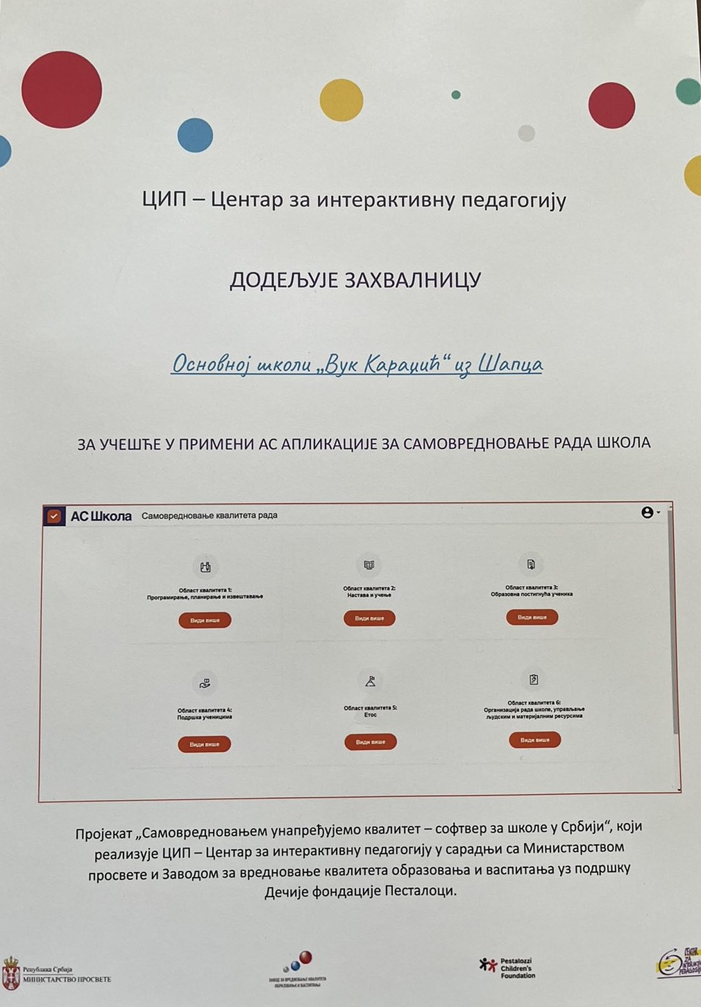20. марта у Београду одржан је завршни скуп у оквиру пројекта „Самовредновањем унапређујемо квалитет - софтвер за школе у Србији“, на ком је представљена АС апликација за самовредновање квалитета рада школа. Скупу су присуствовали представници Министарства просвете, Школских управа, ЗВКОВ-а, Дечје фондације Песталоци, ЦИП-Центра за интерактивну педагогију и администратори школа које су учествовале у пројекту. ОШ „Вук Караџић“ Шабац имала је част да буде једна од 12 школа које су учествовале у пилотирању софтвера за самовредновање, који ће ускоро бити доступан свим школама у Србији. Представница наше школе, Душица Шобић, приказала је у оквиру своје радне групе употребу софтвера, а у пленарном делу говорила је о питањима која се тичу примене софтвера у нашој школи.