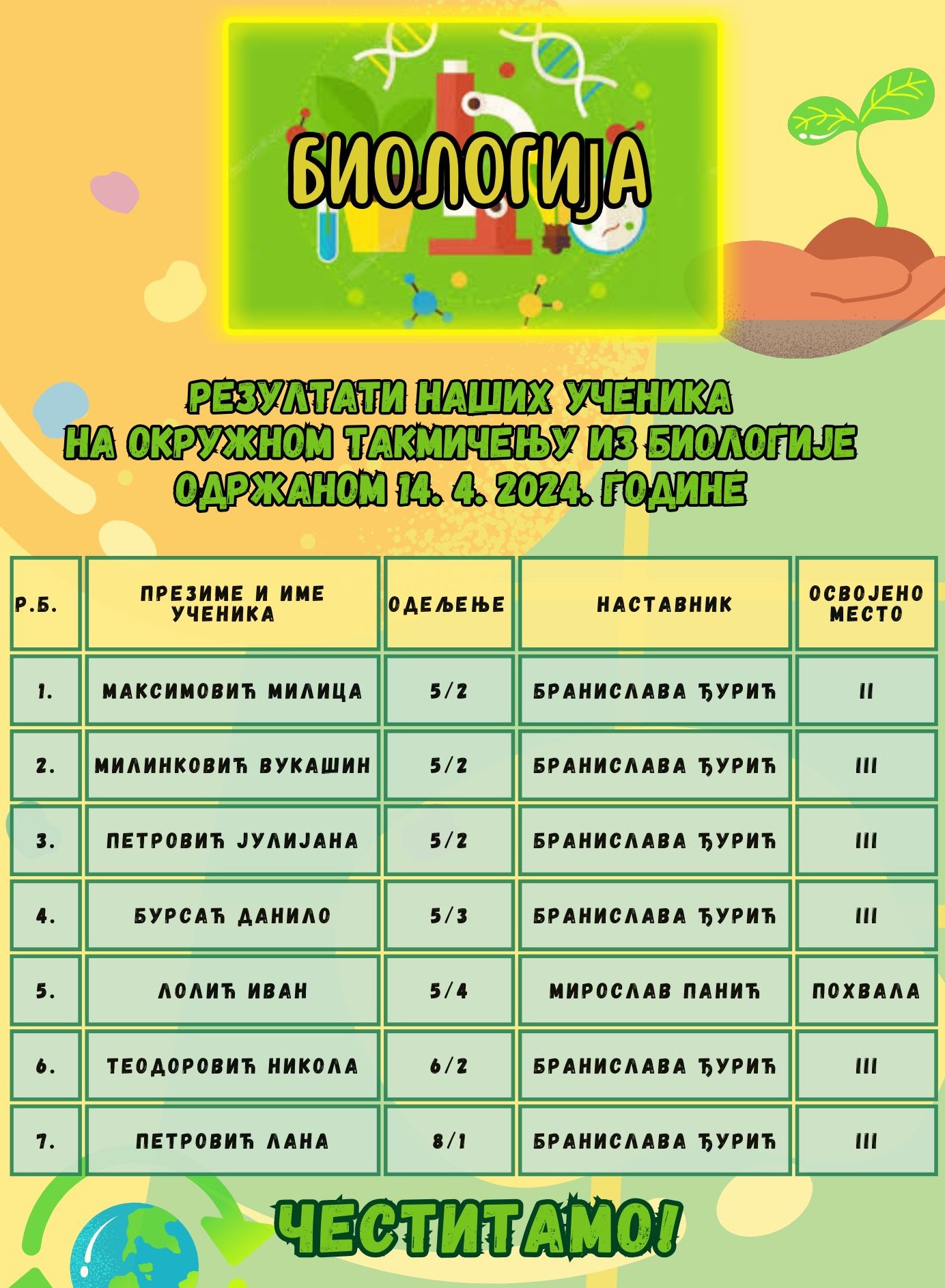 Резултати наших ученика на окружном такмичењу из биологије, одржаном 14.4.2024. године. Честитамо!