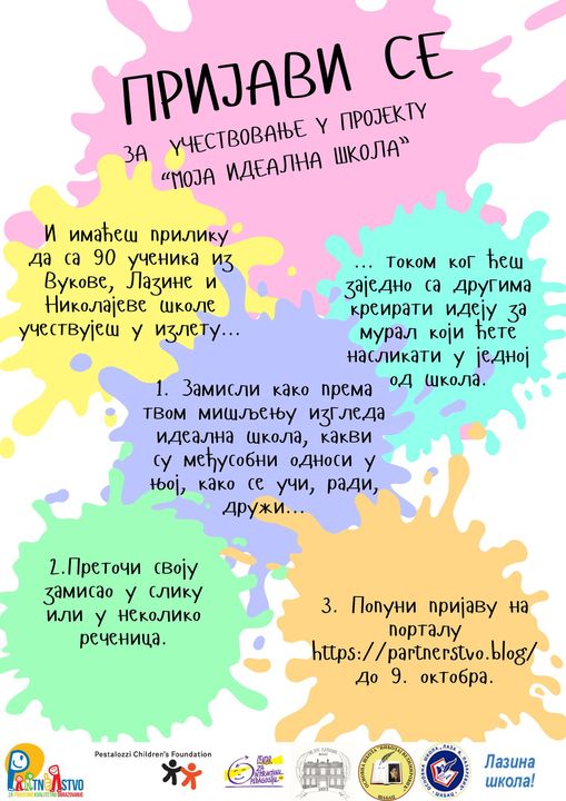 Позив за ученике ОШ "Вук Караџић", ОШ "Лаза К. Лазаревић" и ОШ "Николај Велимировић" за учешће у заједничкој акцији "Моја идеална школа". Линк за пријаву: https://docs.google.com/forms/d/e/1FAIpQLSdh9_HKWTqE6IPjd8Hw3Gn8Y4kwwPXphh3Hh2H5akyeMxM4nQ/viewform?vc=0&c=0&w=1&flr=0