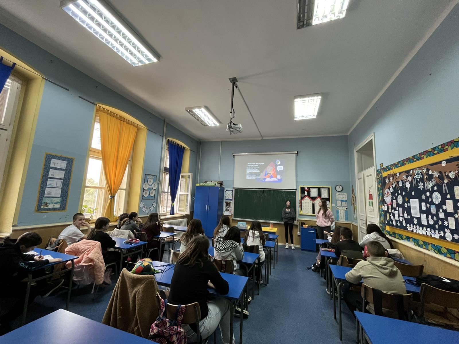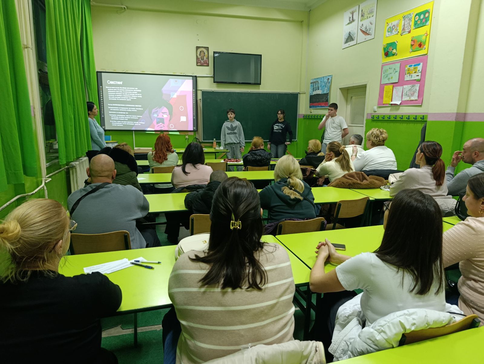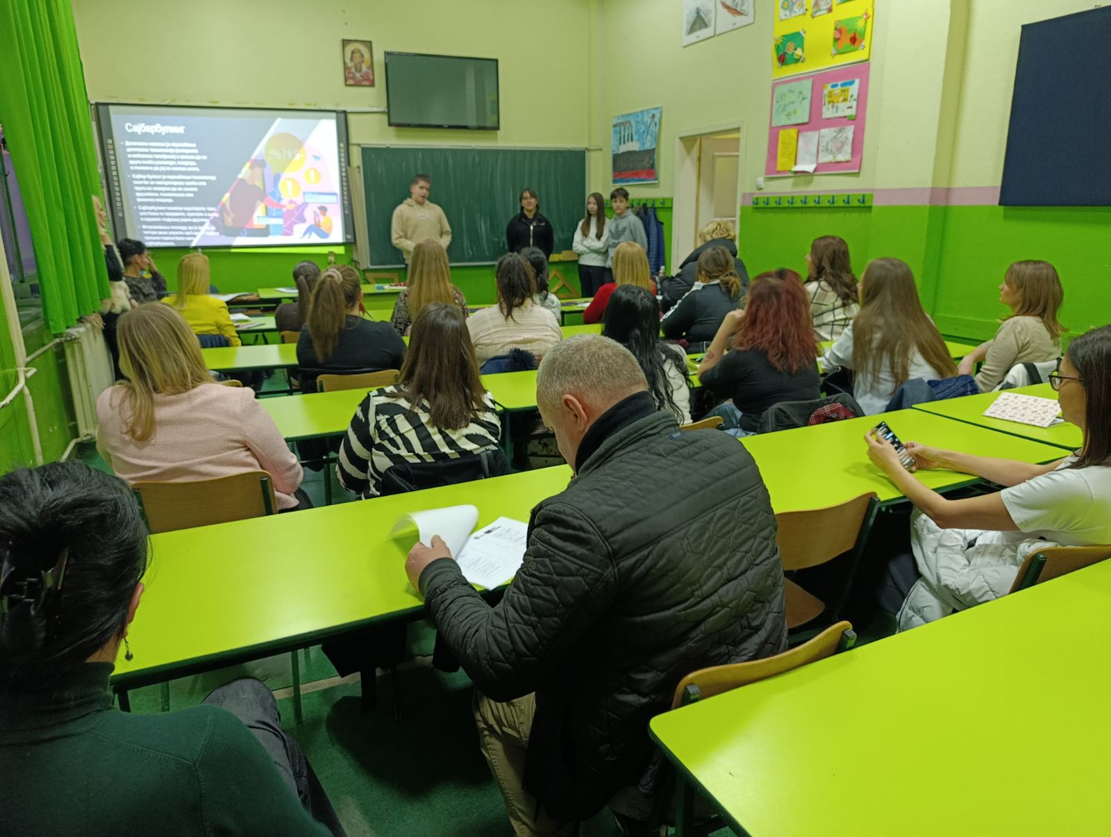 У оквиру пројекта „Адолесценти у акцији – борба против дигиталног насиља“, ученици седмог разреда су током ове недеље одржали дијалоге са ученицима, родитељима, наставницима и Саветом родитеља, где су их кроз презентацију упознали са правилима понашања на интернету, безбедном коришћењу интернета и дигиталном насиљу, као и о корацима које треба предузети уколико се осетимо небезбедно.