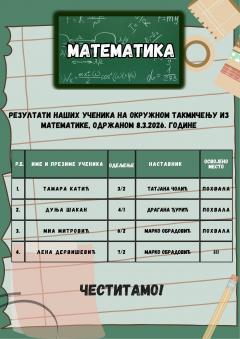 Резултати наших ученика на окружном такмичењу из математике, одржаном 8. 3. 2026. године. Честитамо!