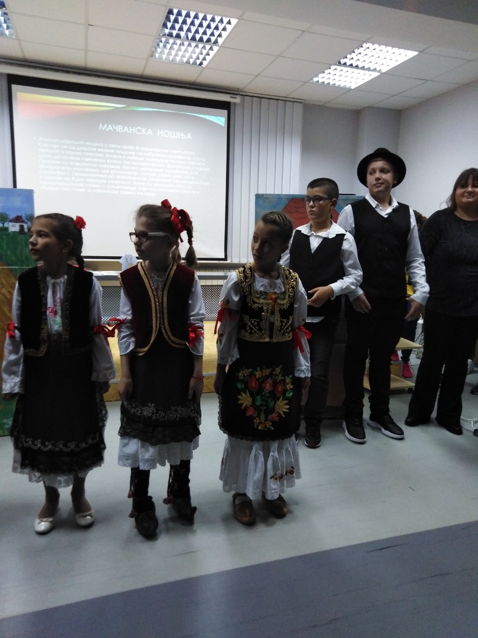 У другом делу присутнима је представљена Мачванска ношња са свим деловима (очигледно излагање и мултимедијална презентација), а онда су присутни правили декоративне елементе (шаре) са јелека и кошуља од папира. Радионицу народне традиције су радиле Снежана Поповић и Весна Петровић, професори разредне наставе.