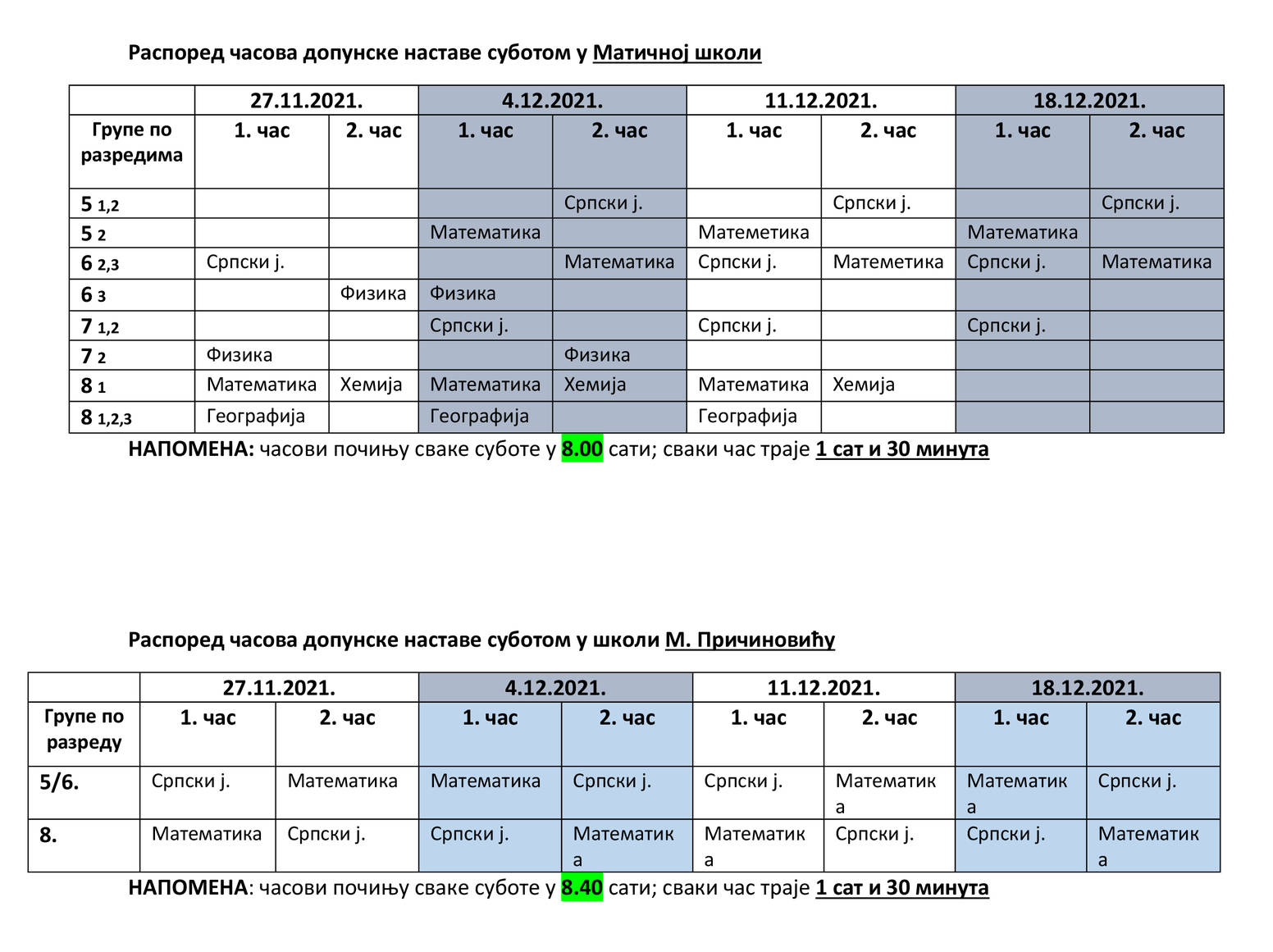 НАПОМЕНА: часови почињу сваке суботе у 8.00 сати; сваки час траје 1 сат и 30 минута