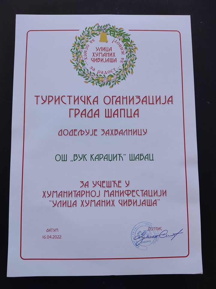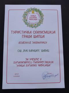 У суботу 16. априла наши ученици извели су фолклорни наступ под називом "Вуково прело" у оквиру хуманитарне акције "Улица хуманих чивијаша" у организацији Туристичке организације града Шапца. Припрему наступа водиле су учитељица Тања Ђукић и библиотекарка Милица Петровић, а овим путем се захваљујемо родитељима на лепој и успешној сарадњи током припрема.