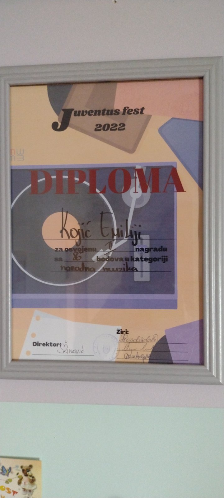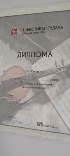 Емилија Којић, ученица одељења 6/2 наше школе, као и Музичке школе „Михаило Вукдраговић“ у класи професорке Јасмине Атанацковић, освојила је 1. место на такмичењу у теорији музике у својој категорији, 2. место на „11. фестивалу гудача“ и 2. место на „Јувентус фесту 2022“. Имала је част да буде на пријему у градској кући, где је градоначелник најуспешнијим ученицима уручио захвалнице и новчане награде.
