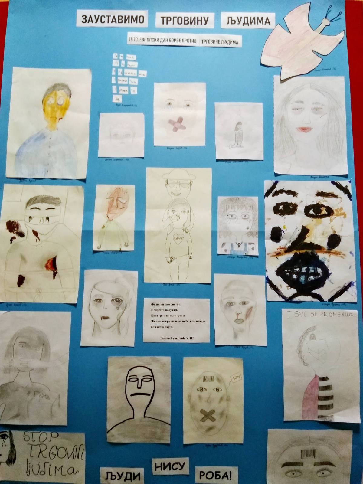 И ове године је у нашој школи обележен 18. октобар као Европски дан борбе против трговине људима. Ученици који су имали час ликовног тај дан су се уз помоћ наставнице ликовне културе Ане Ивковић и психолога школе Данијеле Рељић упознали са проблемом трговине људима те су имали задатак да прикажу портрет жртве, а ученици седмог разреда су на часовима одељењског старешине одгледали филм „Посматрачи“ који се бави управо овом темом.