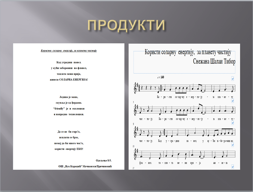 Продукти пројектне наставе: презентација у "Power Pointu", "Word" документи, фотографије, макете, пано, ликовни радови, ауторска песма (текст и музика), видео клип креиран на ауторску песму који у себи садржи све пројектне активности.