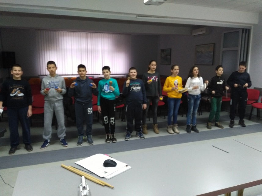 На музичкој радионици ученици су изводили дечје песме певањем, свирањем и прикладним кореографијама. У завршном делу су слушали музику и анализирали карактер слушаних композиција и смишљали покрете прикладне за њих. На крају радионице је организовано такмичење,квиз кога су играла три тима.