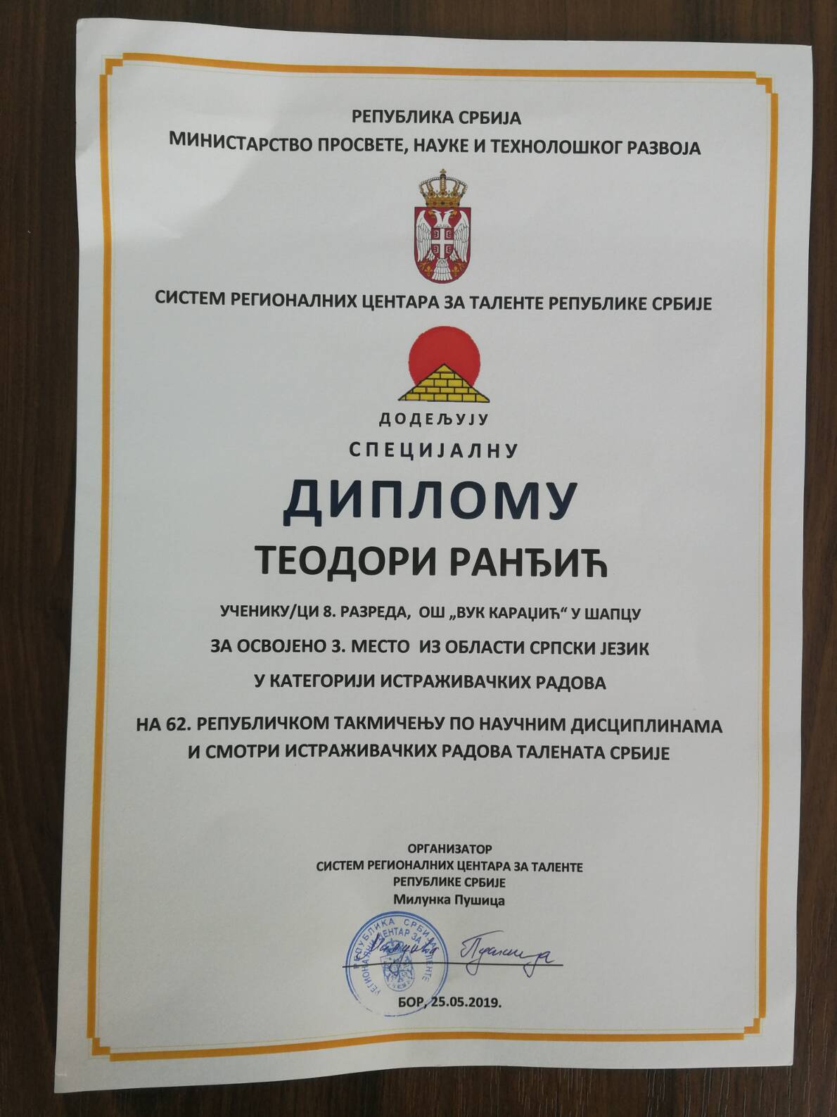 Наша ученица, Теодора Ранђић 8/3, остварила је велики успех! Она је освојила 3. место из области српског језика у категорији истраживачких радова на 62. Републичком такмичењу по научним дисциплинама и смотри истраживачких радова талената Србије.