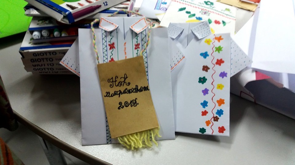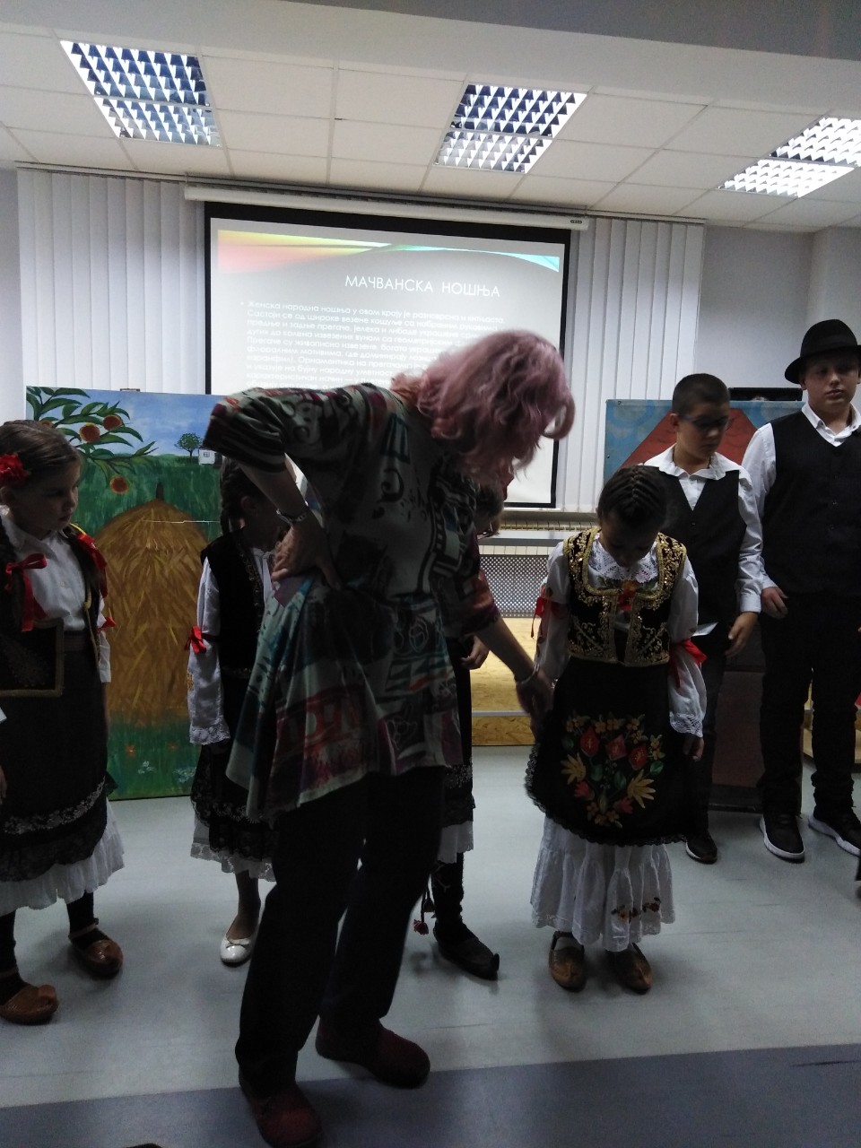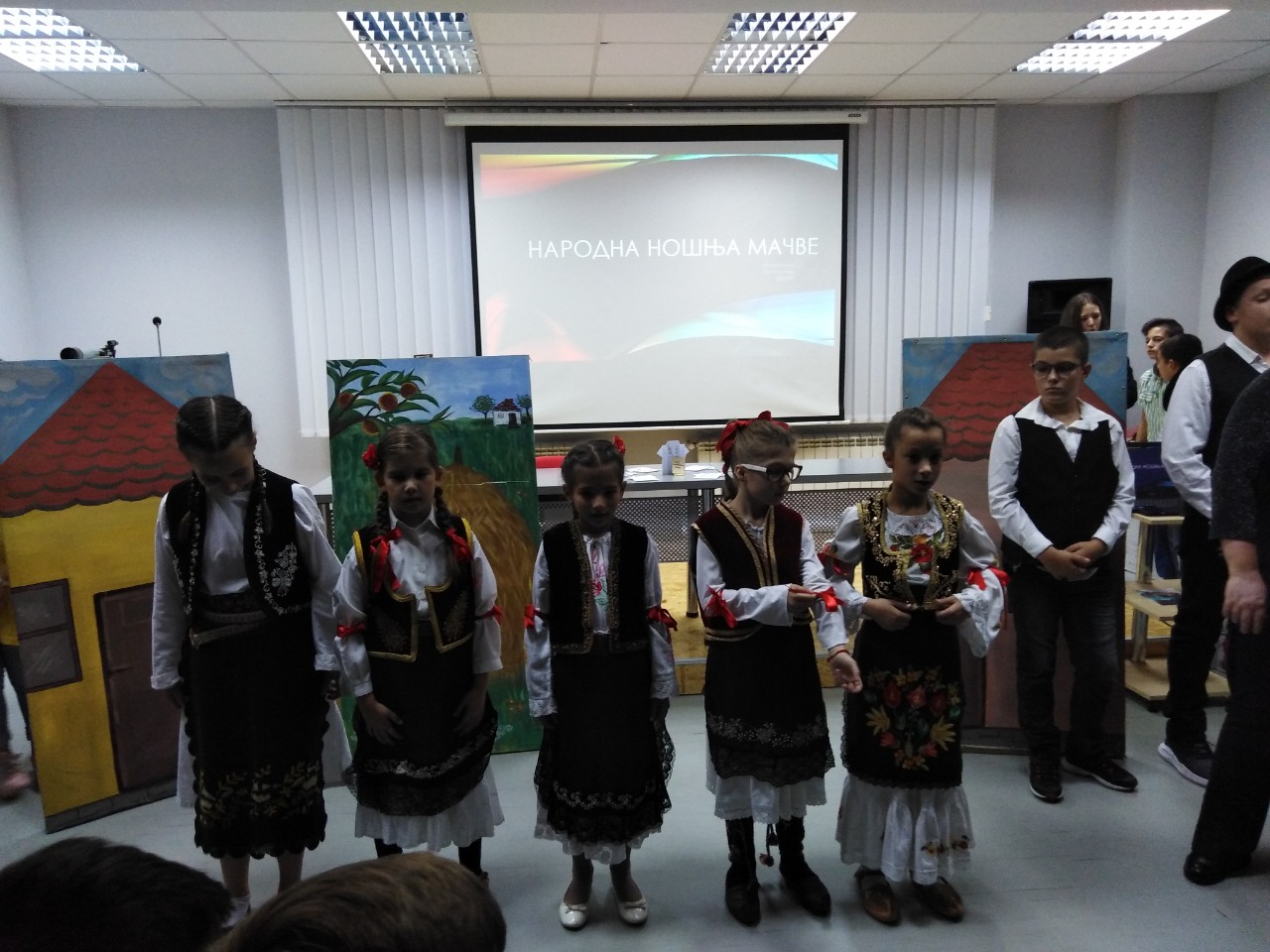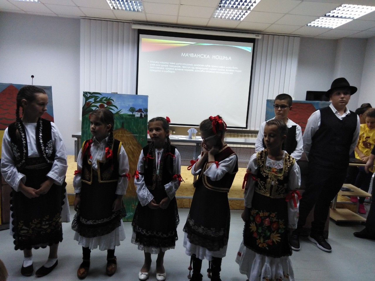 У другом делу присутнима је представљена Мачванска ношња са свим деловима (очигледно излагање и мултимедијална презентација), а онда су присутни правили декоративне елементе (шаре) са јелека и кошуља од папира. Радионицу народне традиције су радиле Снежана Поповић и Весна Петровић, професори разредне наставе.