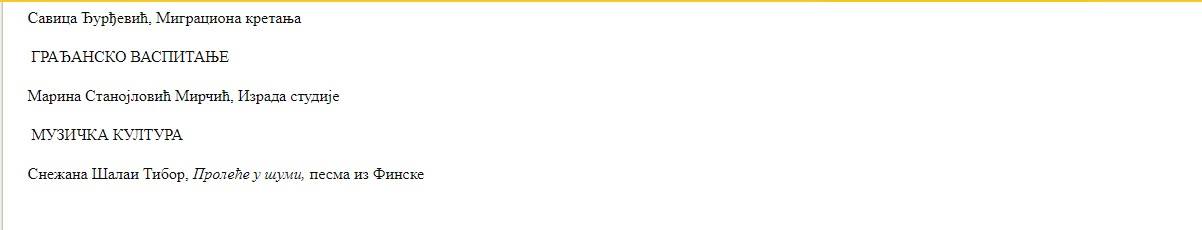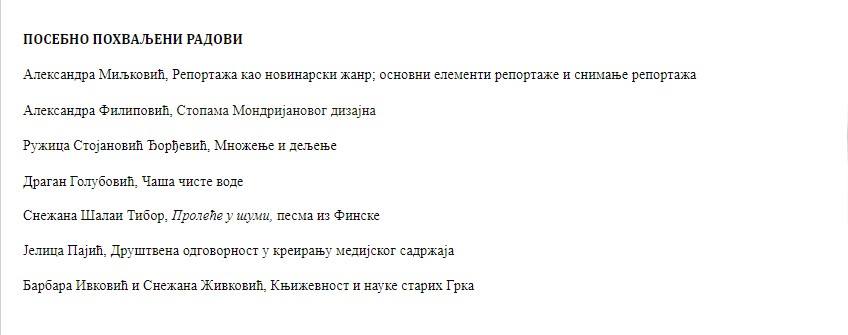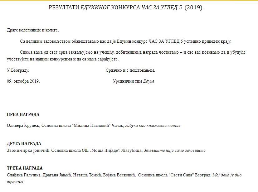 На конкурсу ИК “Едука“ намењенom наставницима, за најбоље припреме угледних часова у основној и средњој школи, посебно је похваљен час "Пролеће у шуми" песма из Финске, наставника музичке културе Снежане Шалаи Тибор ОШ "Вук Караџић" Шабац (ИО Мачвански Причиновић).