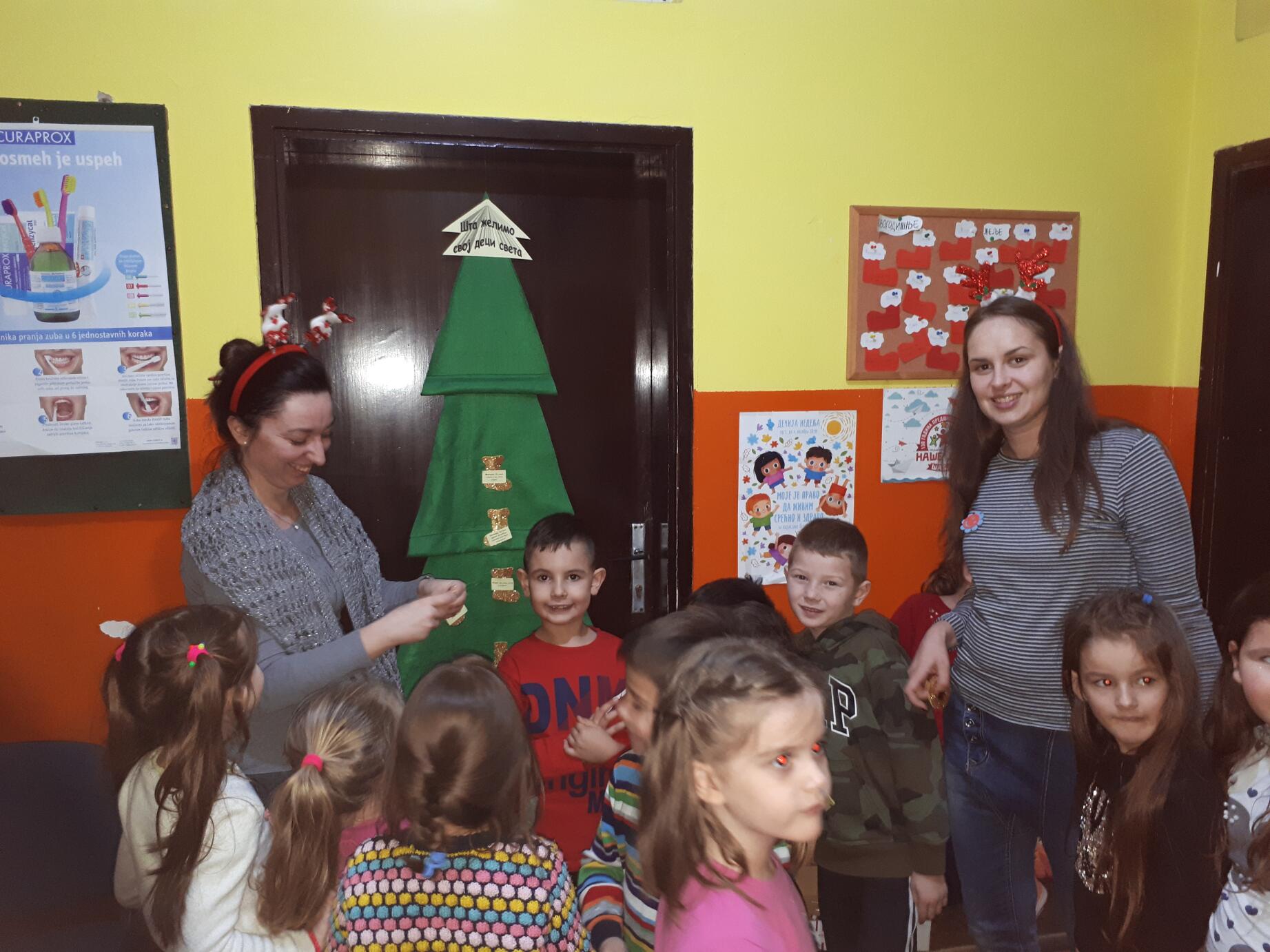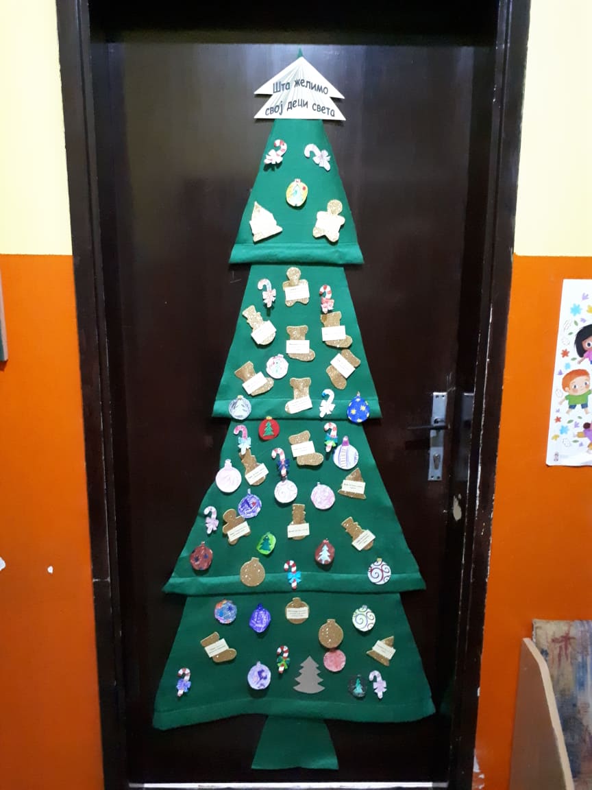 Уз помоћ своје васпитачице Јелене Савић осликали су украсе и написали новогодишње жеље свој деци света, које су потом заједно поставили на јелку.
