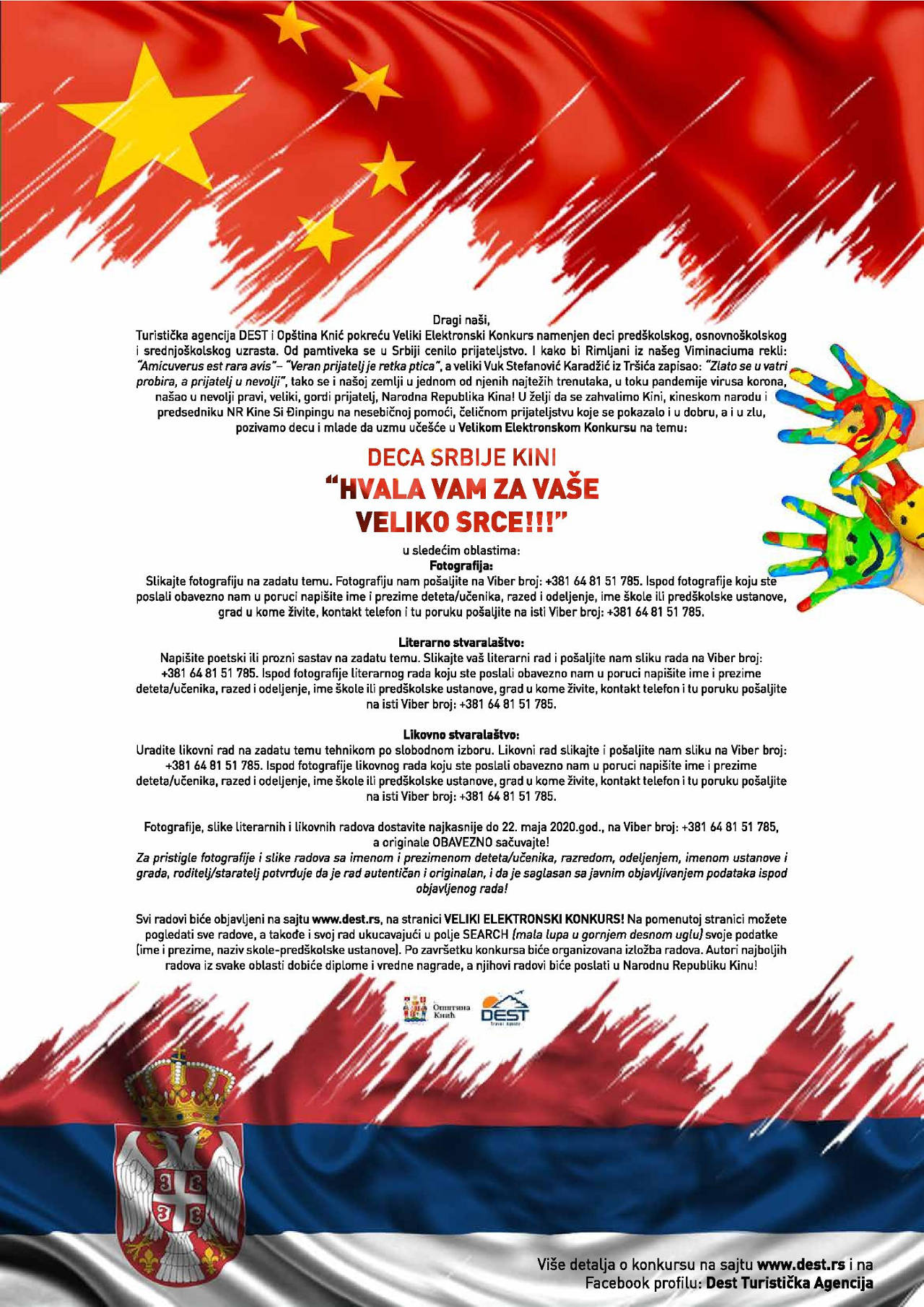 Обавештавамо вас да је отворен електронски конкурс ДЕЦА СРБИЈЕ КИНИ - "ХВАЛА ВАМ ЗА ВАШЕ ВЕЛИКО СРЦЕ". Радове из области фотографије, ликовног и литерарног стваралаштва можете послати у електронској форми на Viber број најкасније до 22. маја 2020. године.