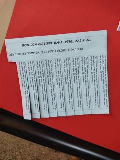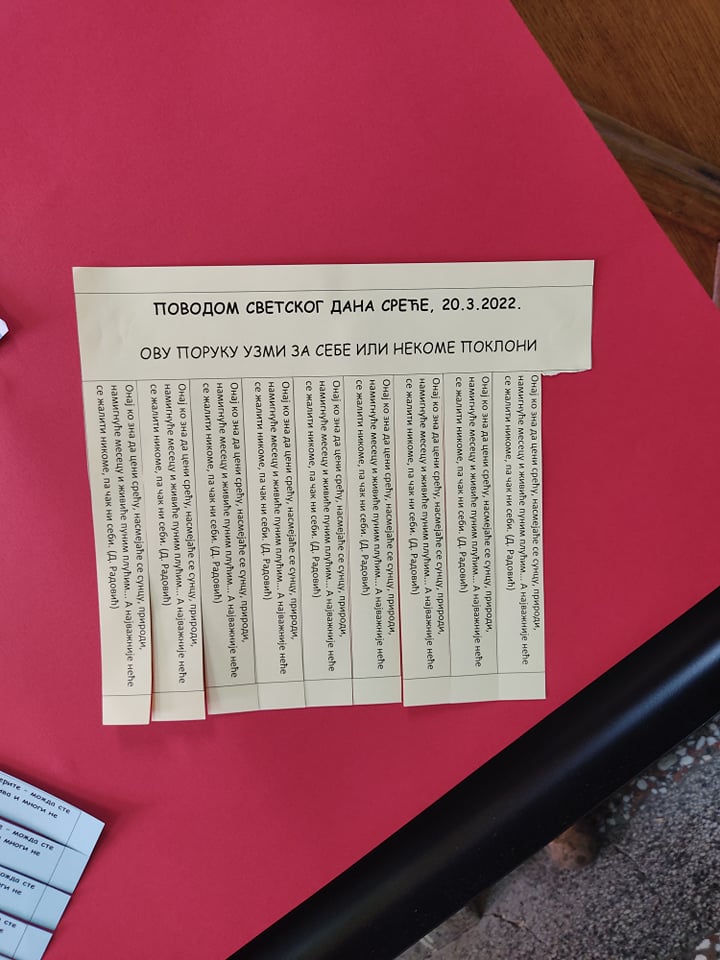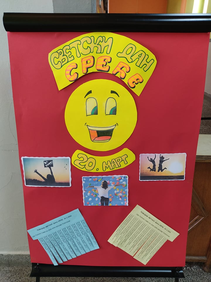 Светски дан среће који се прославља сваког 20. марта, прогласиле су Уједињене нације, а иницијатор овог предлога била је Краљевине Бутан 2011. године. У овој земљи уведена је нова мера националног благостања која се не мери у материјалним богатствима, већ у осећају среће у народу, позната као бруто национална срећа. Циљ обележавања овог датума је да се повећа свест о важности потраге за срећом и добробити светског становништва, с обзиром да је потрага за срећом основни људски циљ. У нашој школи је тим поводом спроведен низ активности: израђен је и истакнут постер који промовише обележавање овог датума и реализоване су кратке радионице у одељењима другог циклуса на тему "Шта ме чини срећним/ом?". УЧИНИМО ЗА НЕКОГА МАЛИ ЗНАК ПАЖЊЕ И УЖИВАЈМО У ОВОМ ДИВНОМ ДАНУ!